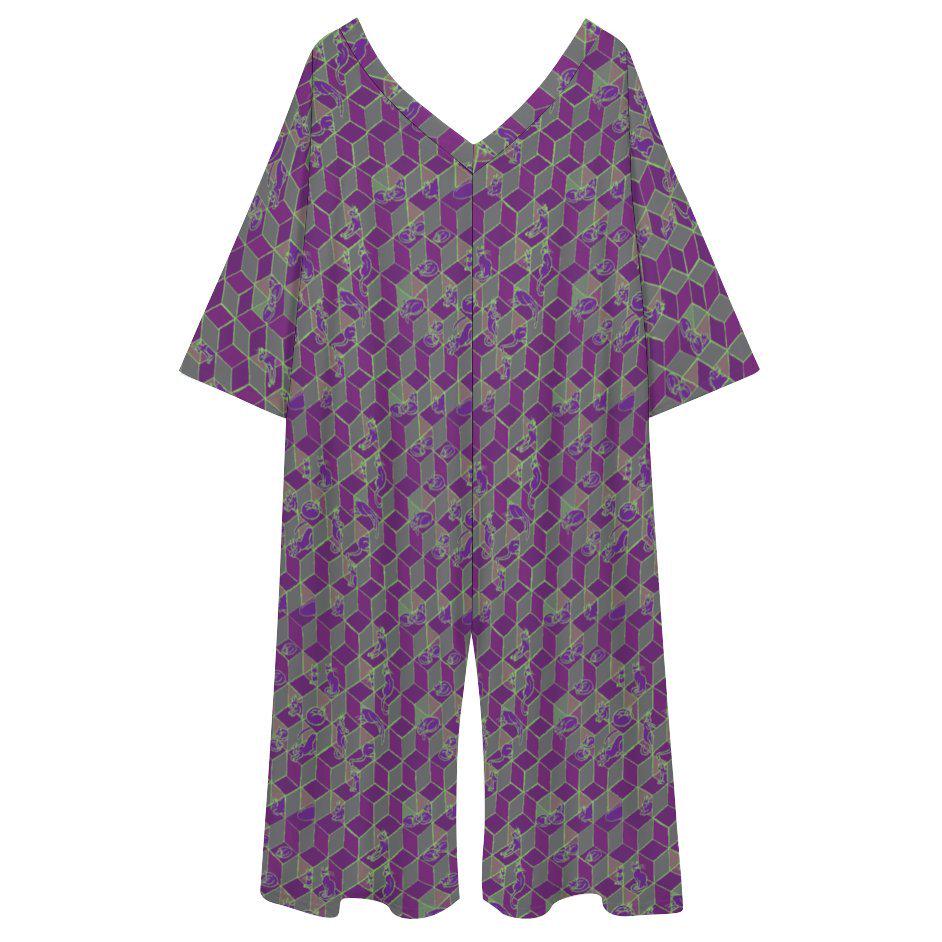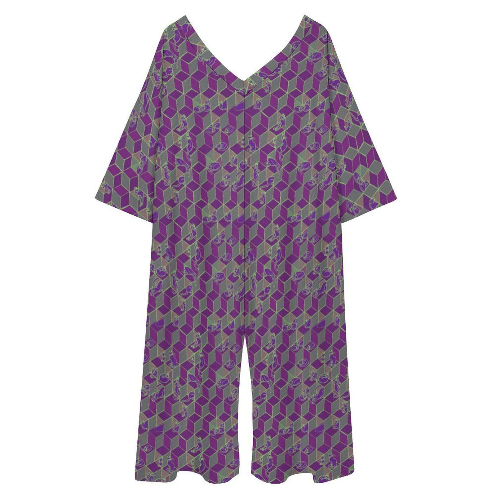 Cats in Boxes, Geometric Optical Illusion, Baggy Relaxed-Fit Jumpsuit, in Plum, One Size Fits All. Great Chillout, Poolside, or Festival Wear!