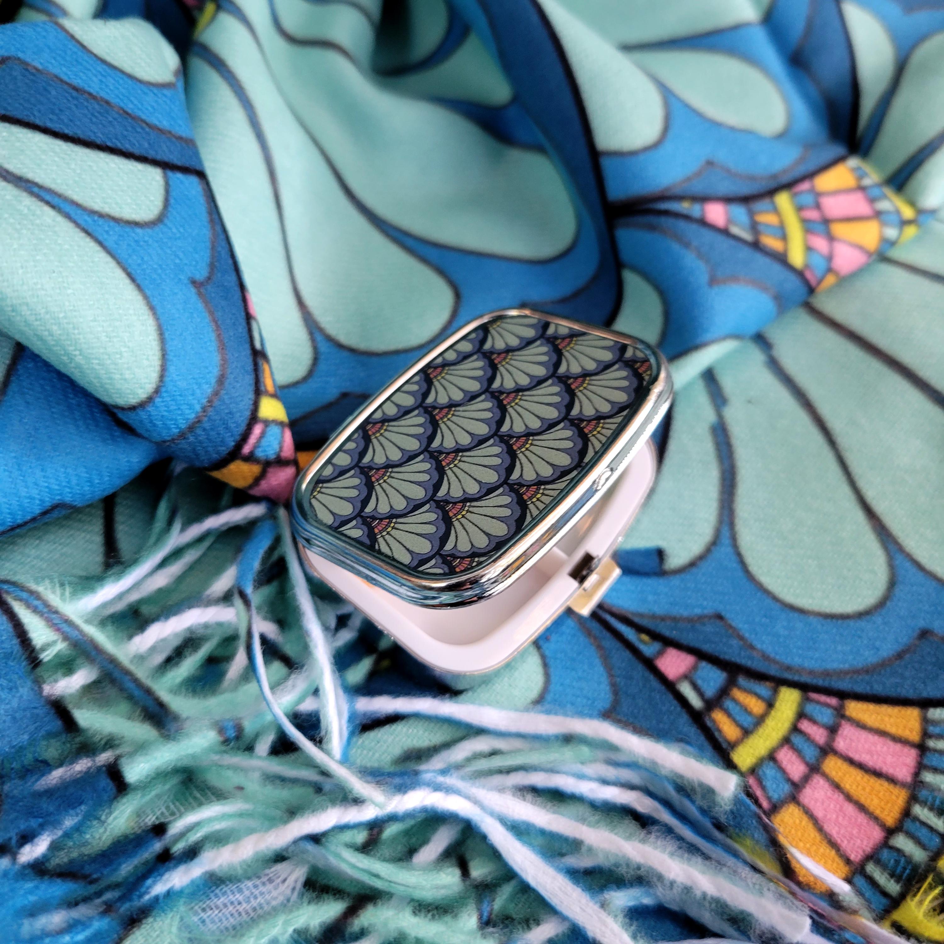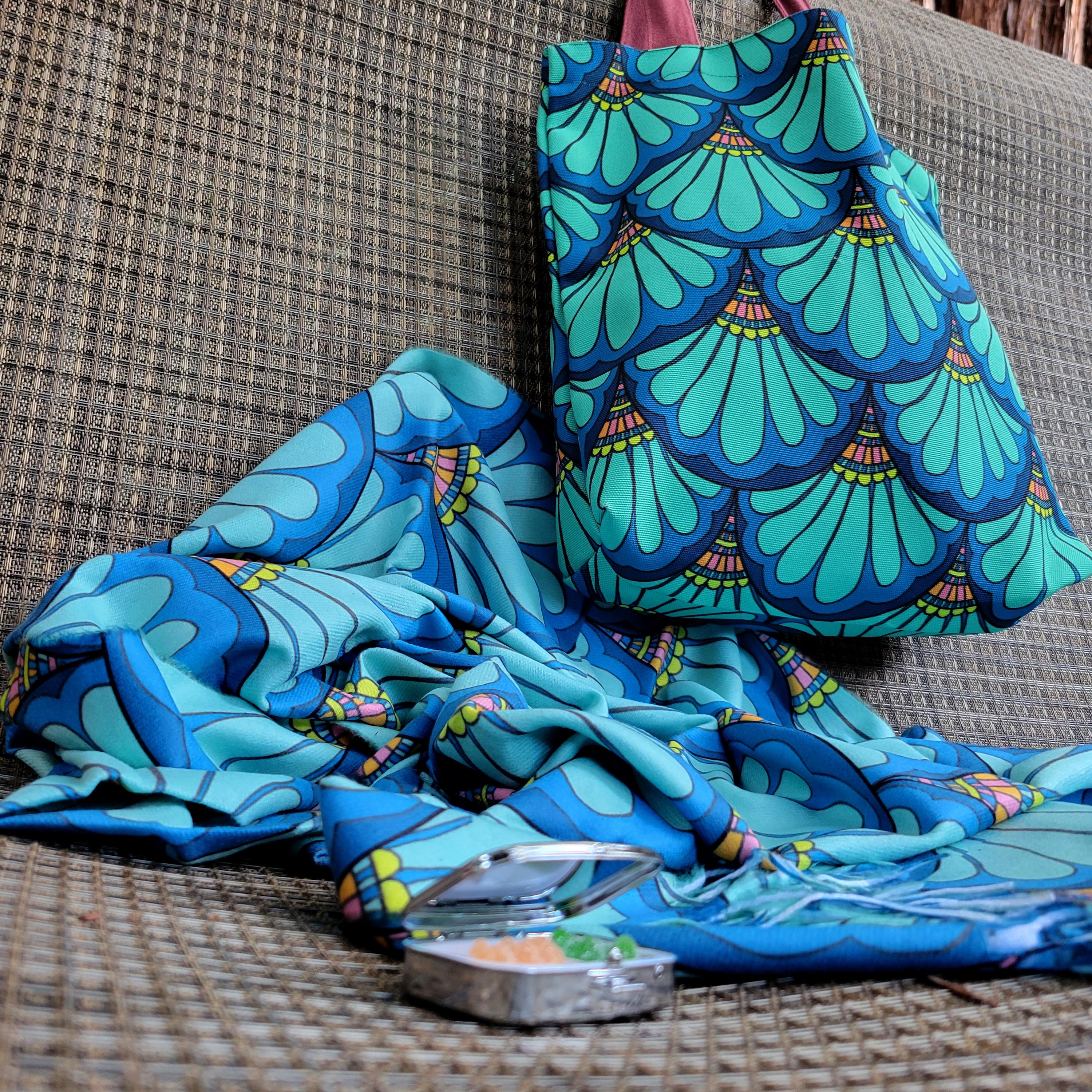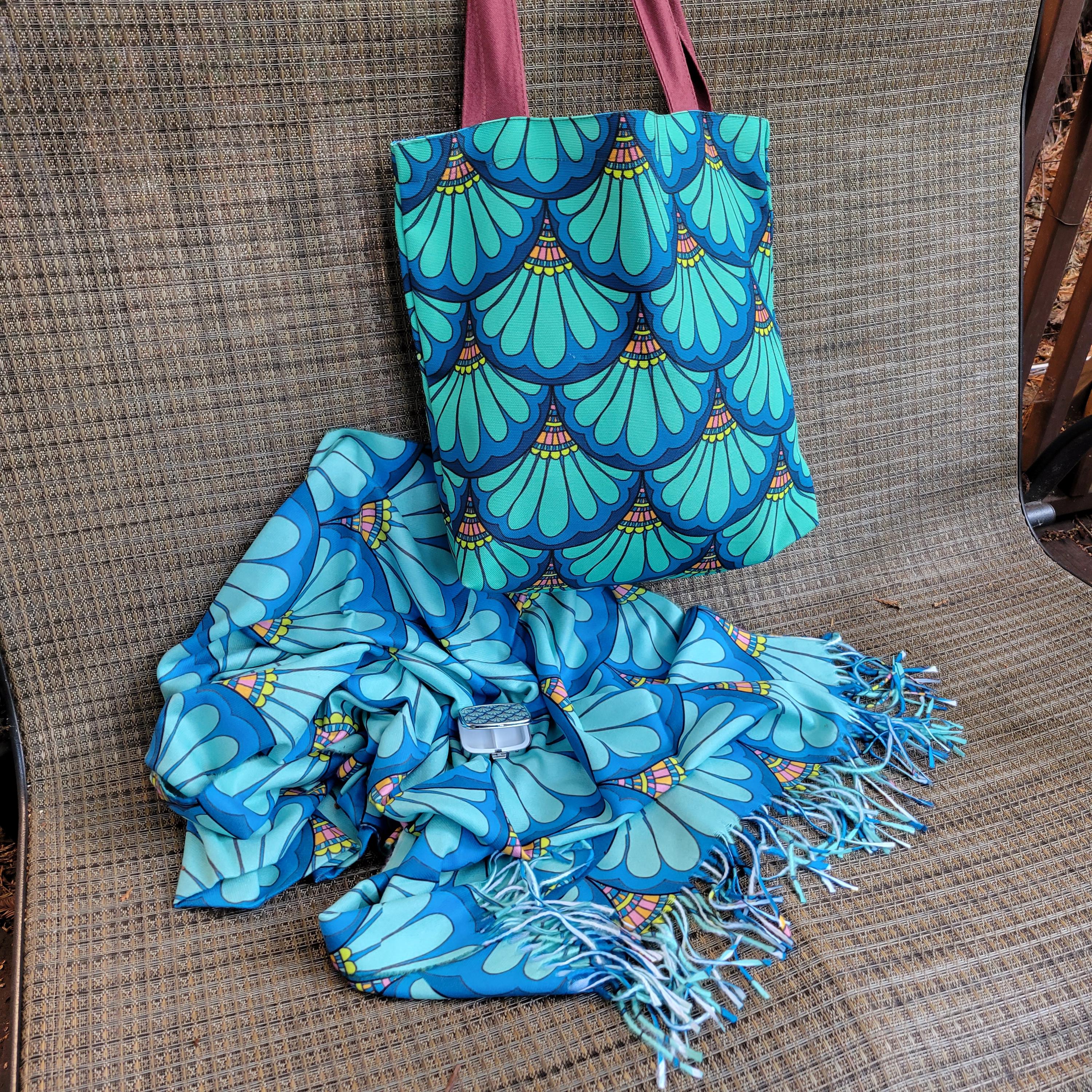 3-Piece Matching Accessory Set, Green Mermaid Scale "Petal Maille" Paisley, with Bag, Scarf, Flask, and Medicine Box.