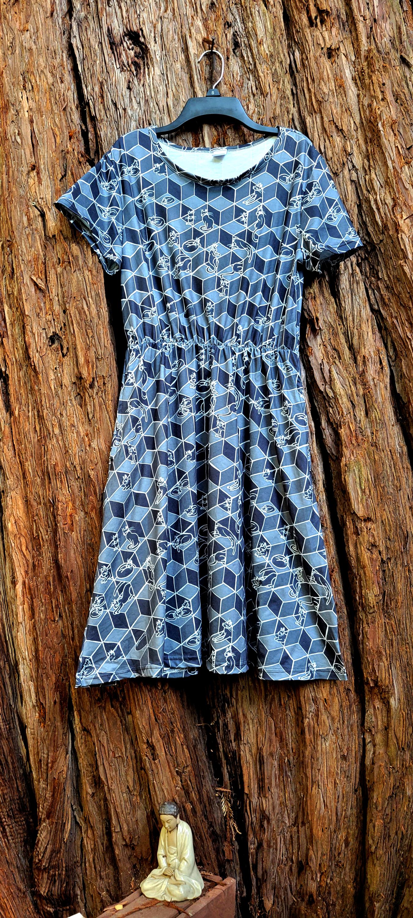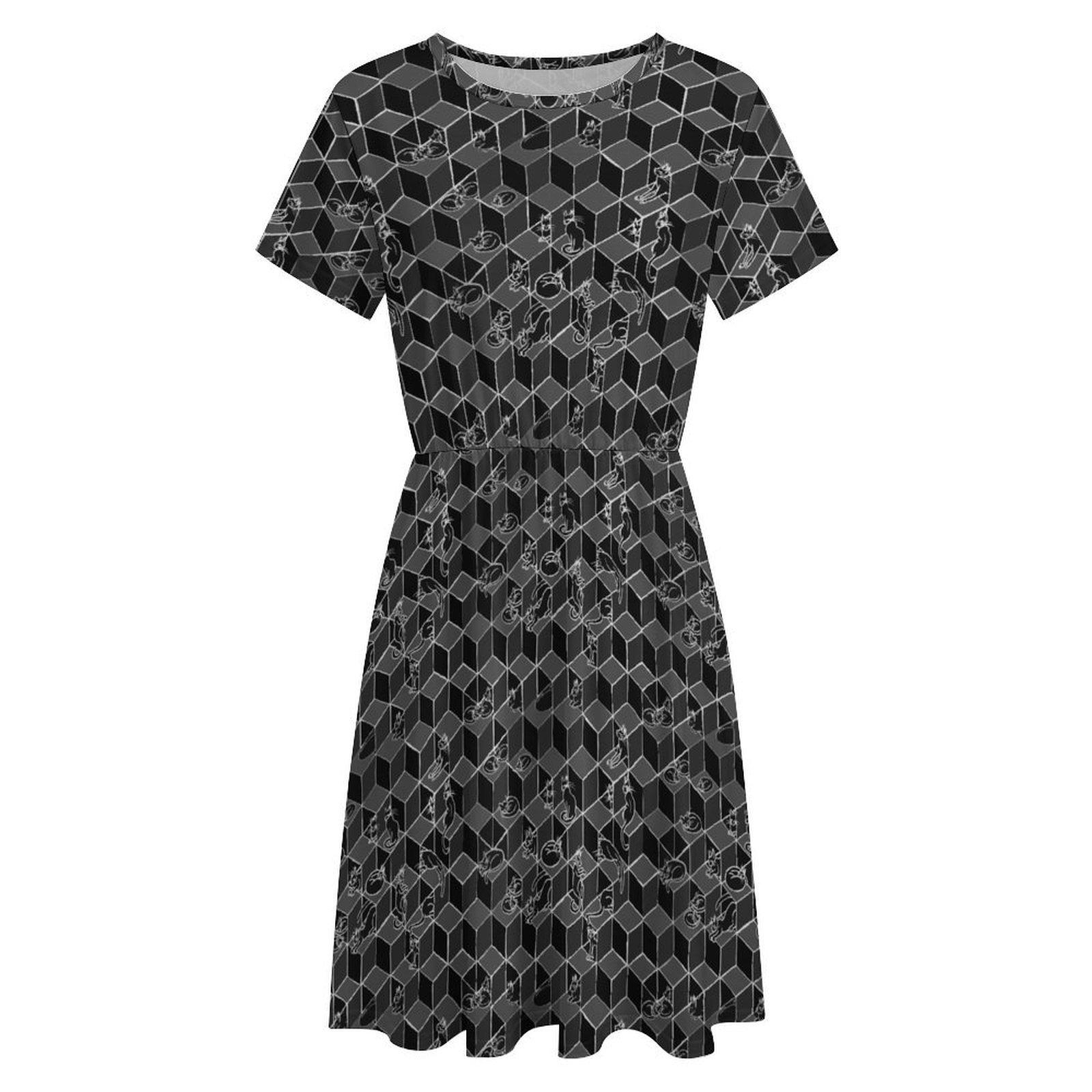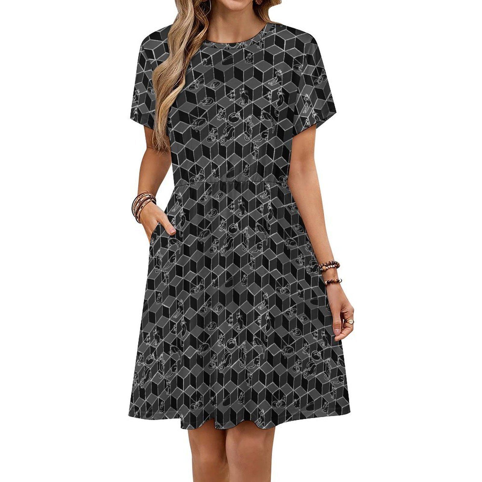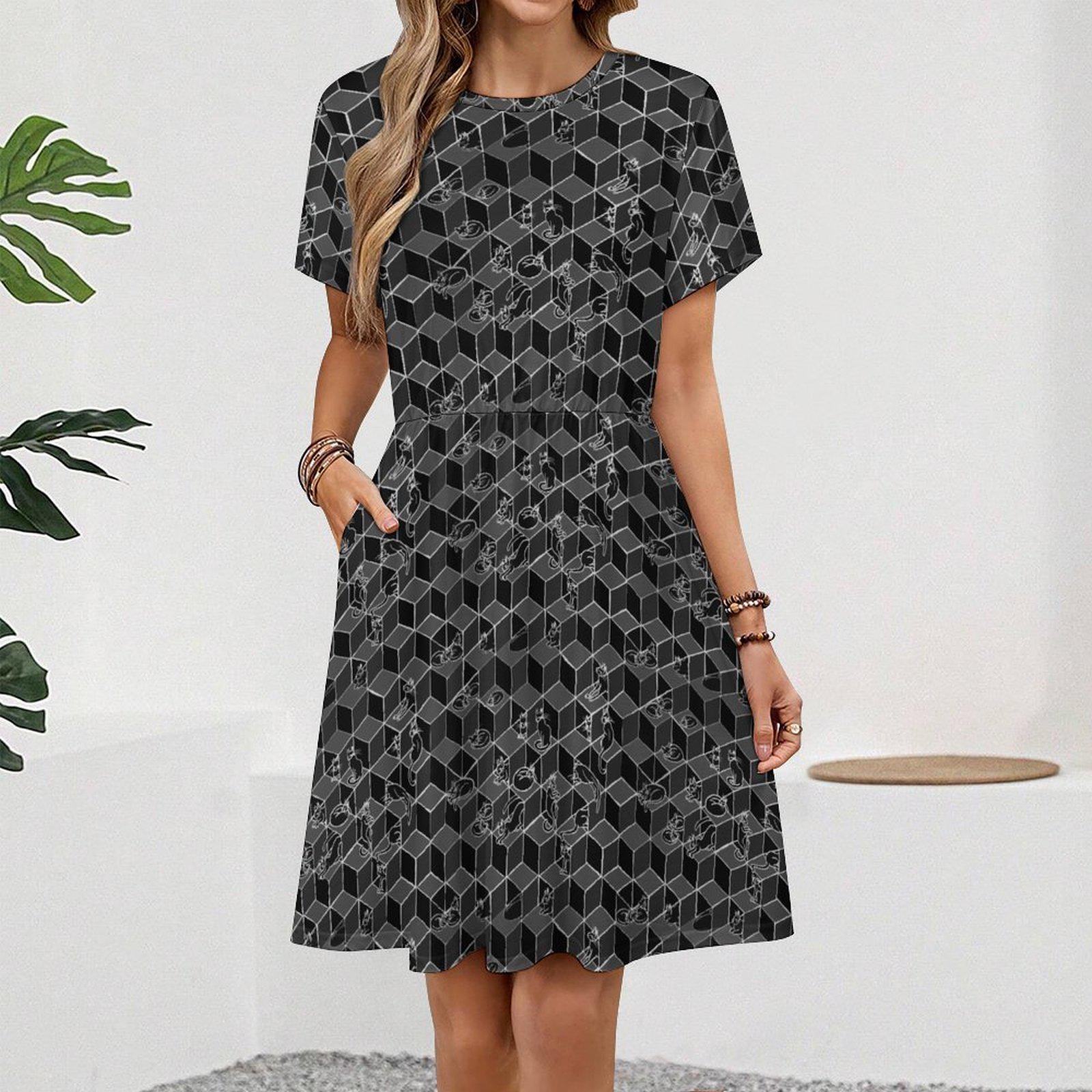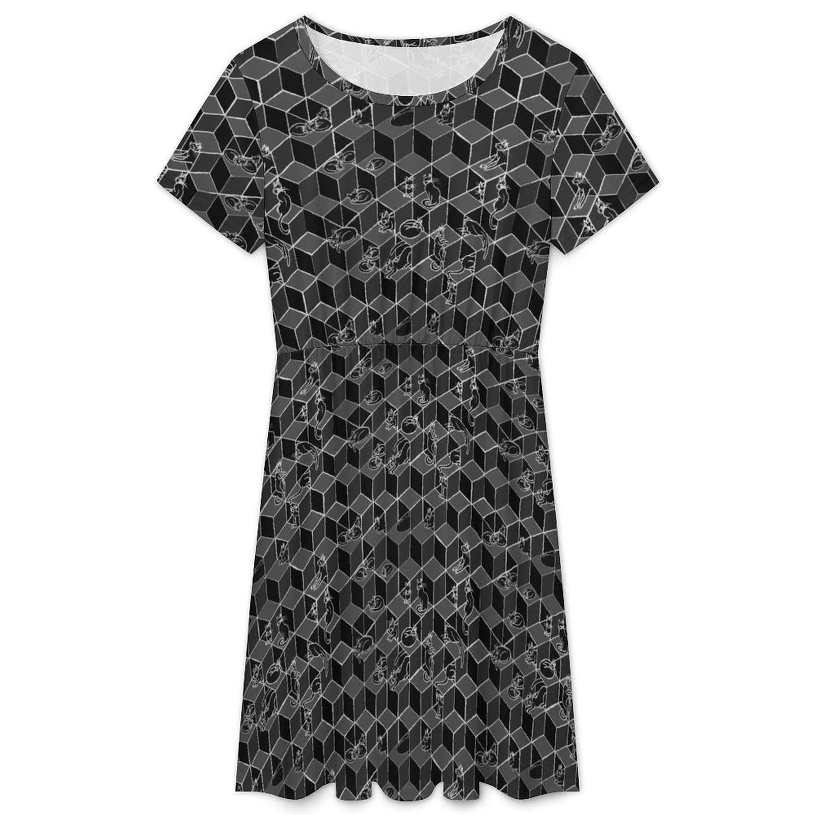 Cats in Boxes, Gathered Tee Shirt Dress with Pockets, Geometric Optical Illusion Print, Black & White.