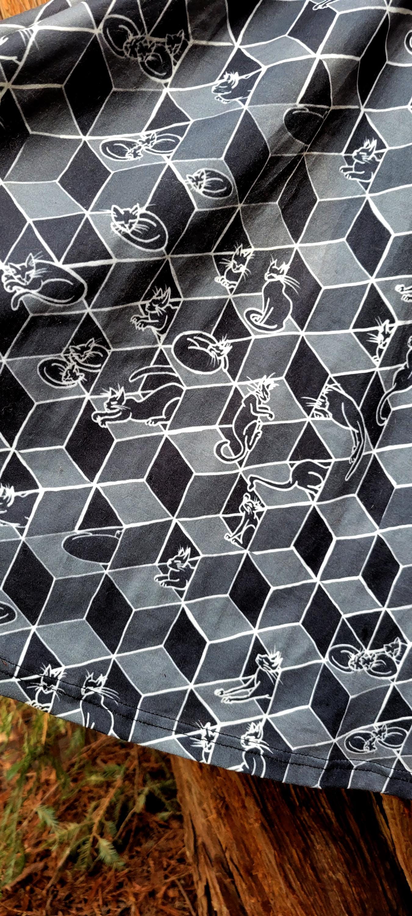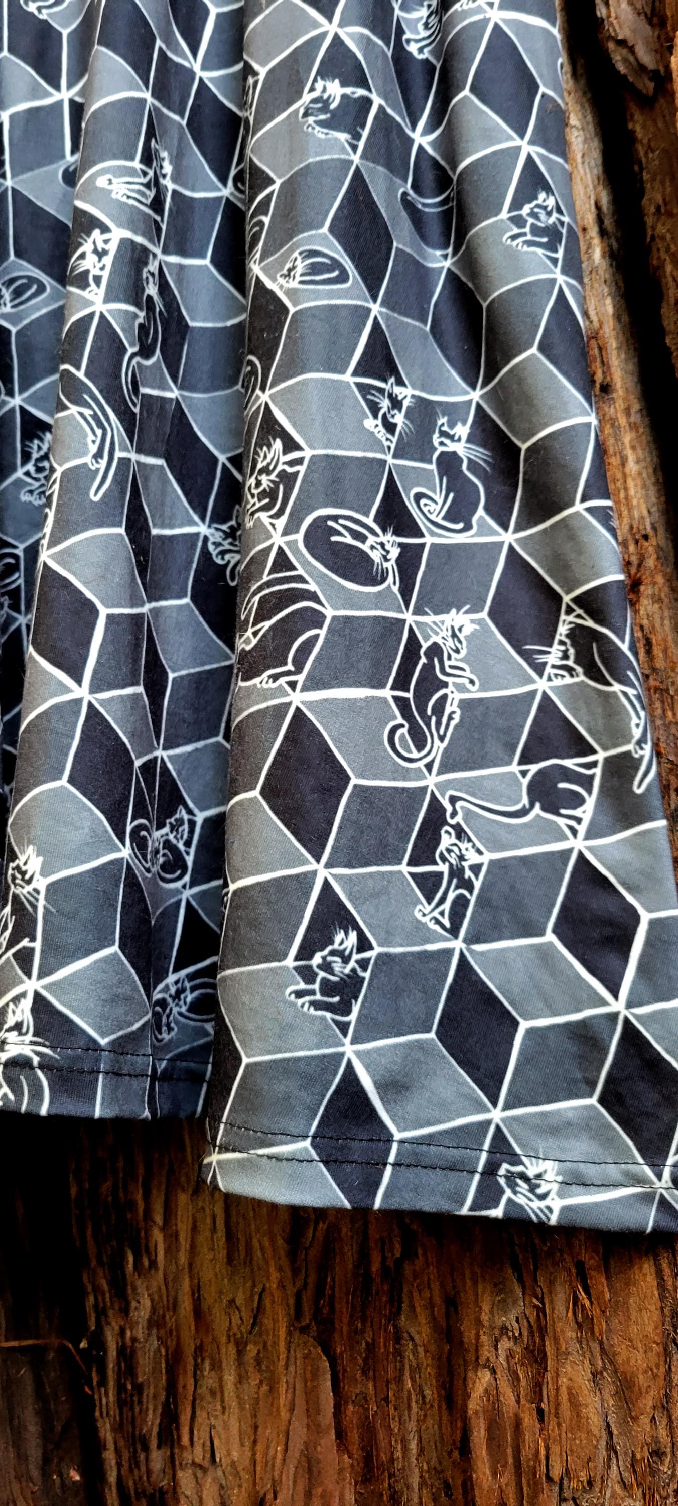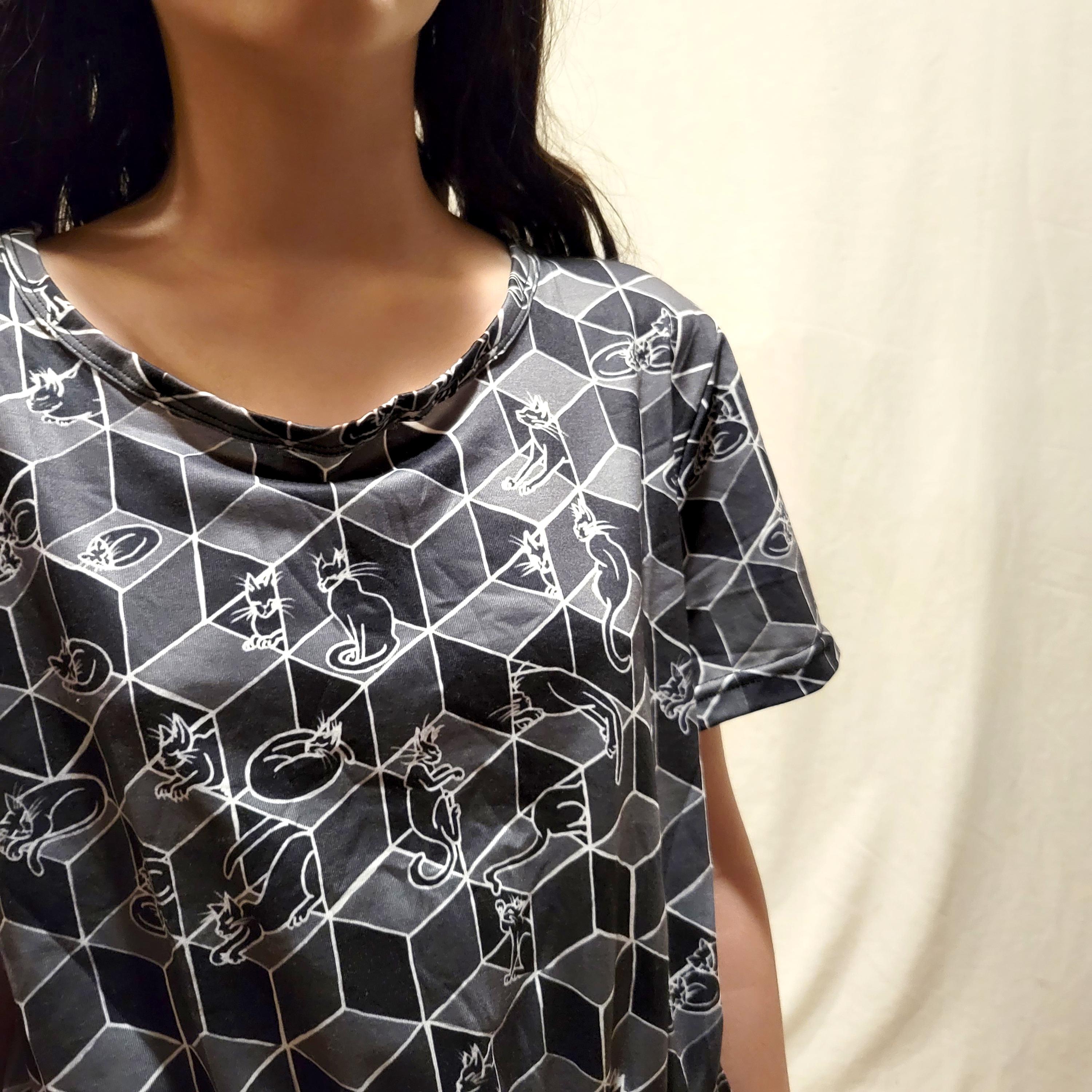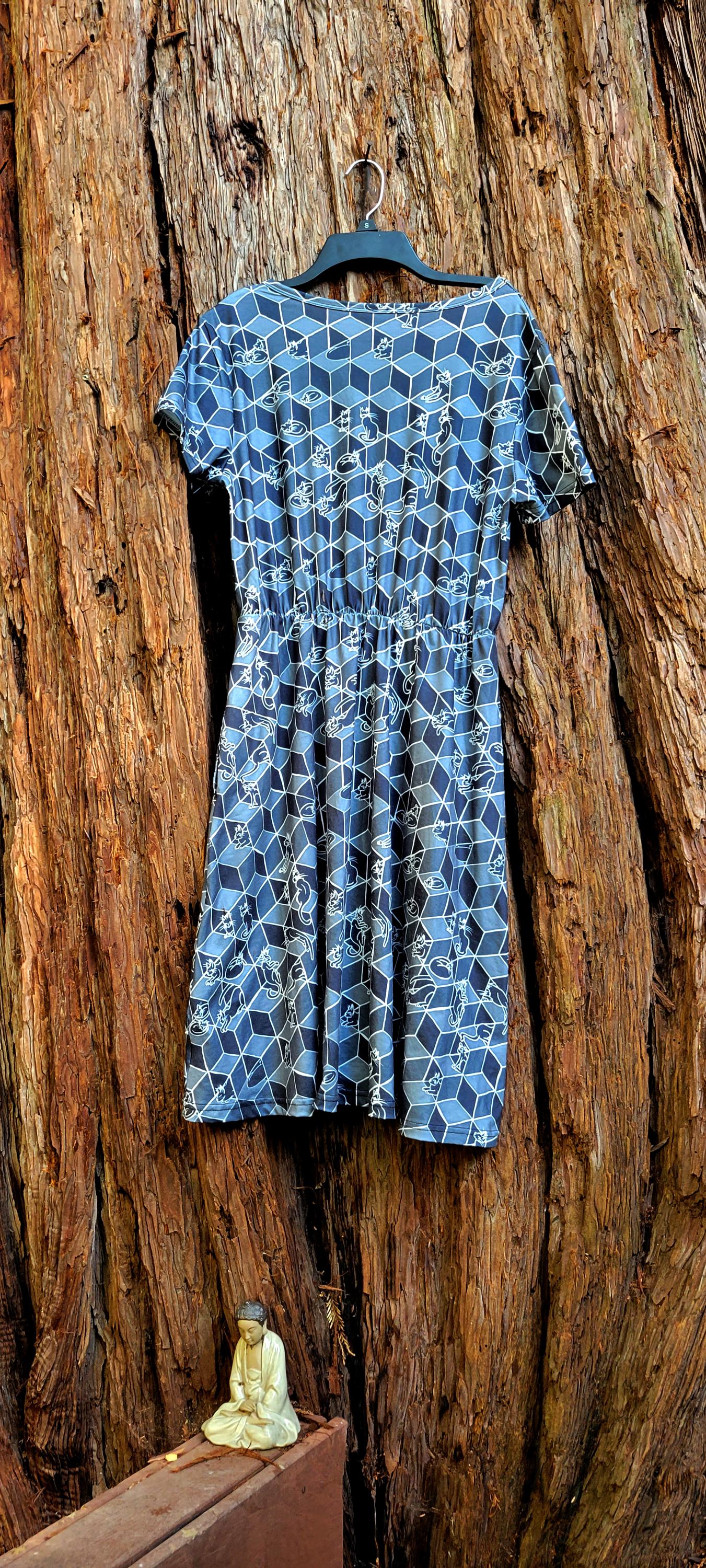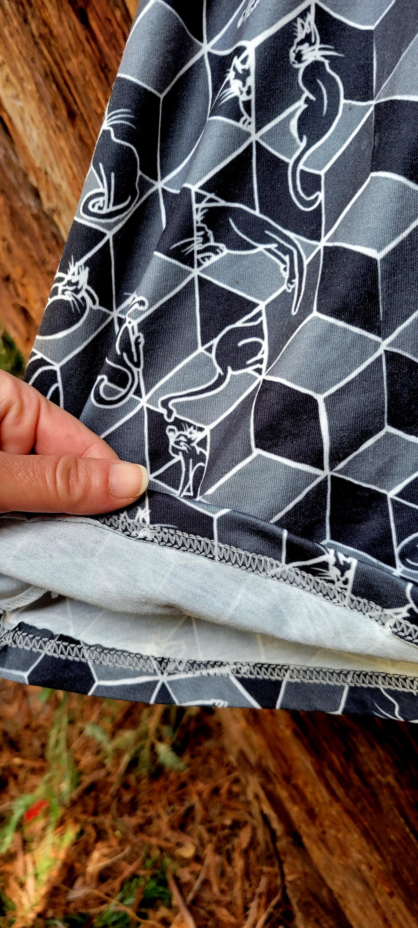 Cats in Boxes, Gathered Tee Shirt Dress with Pockets, Geometric Optical Illusion Print, Black & White.