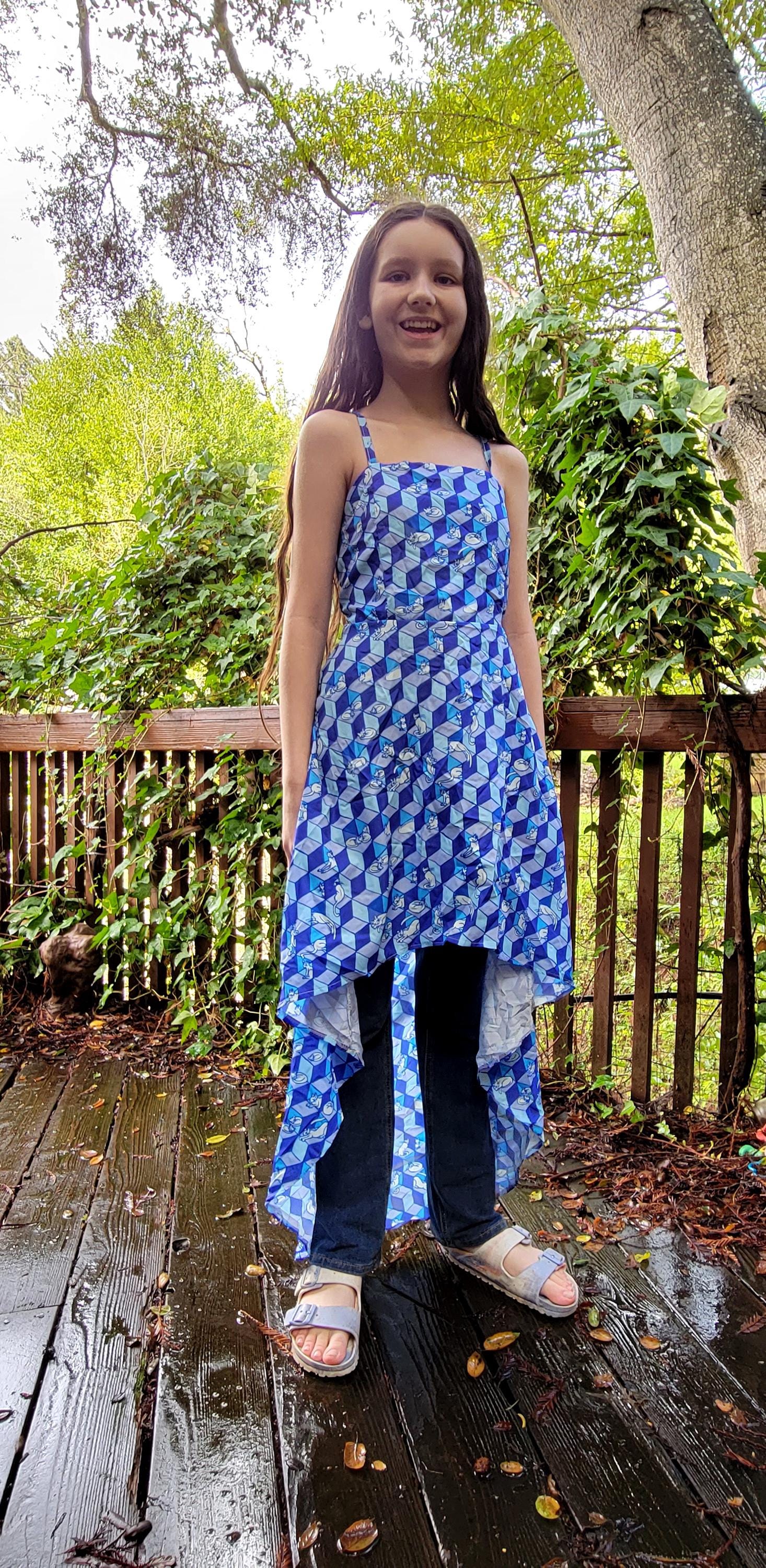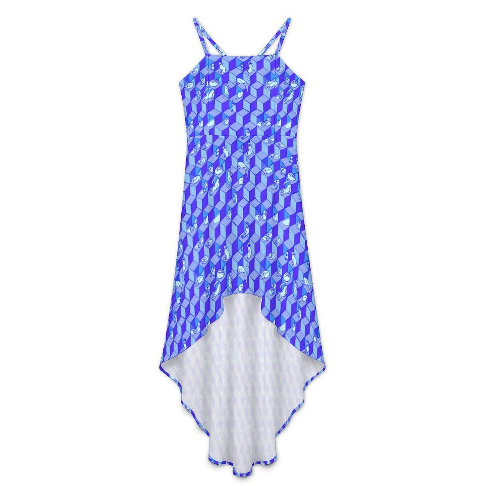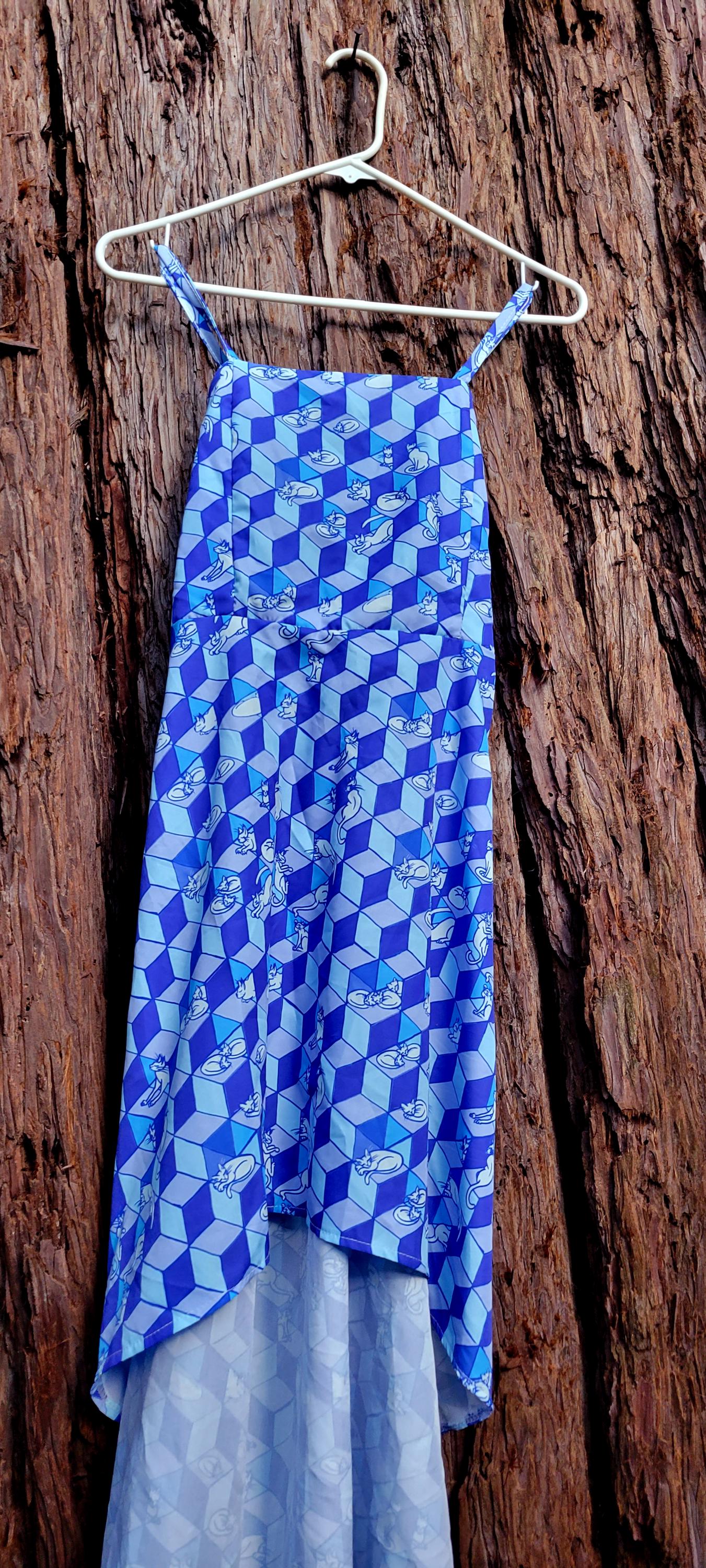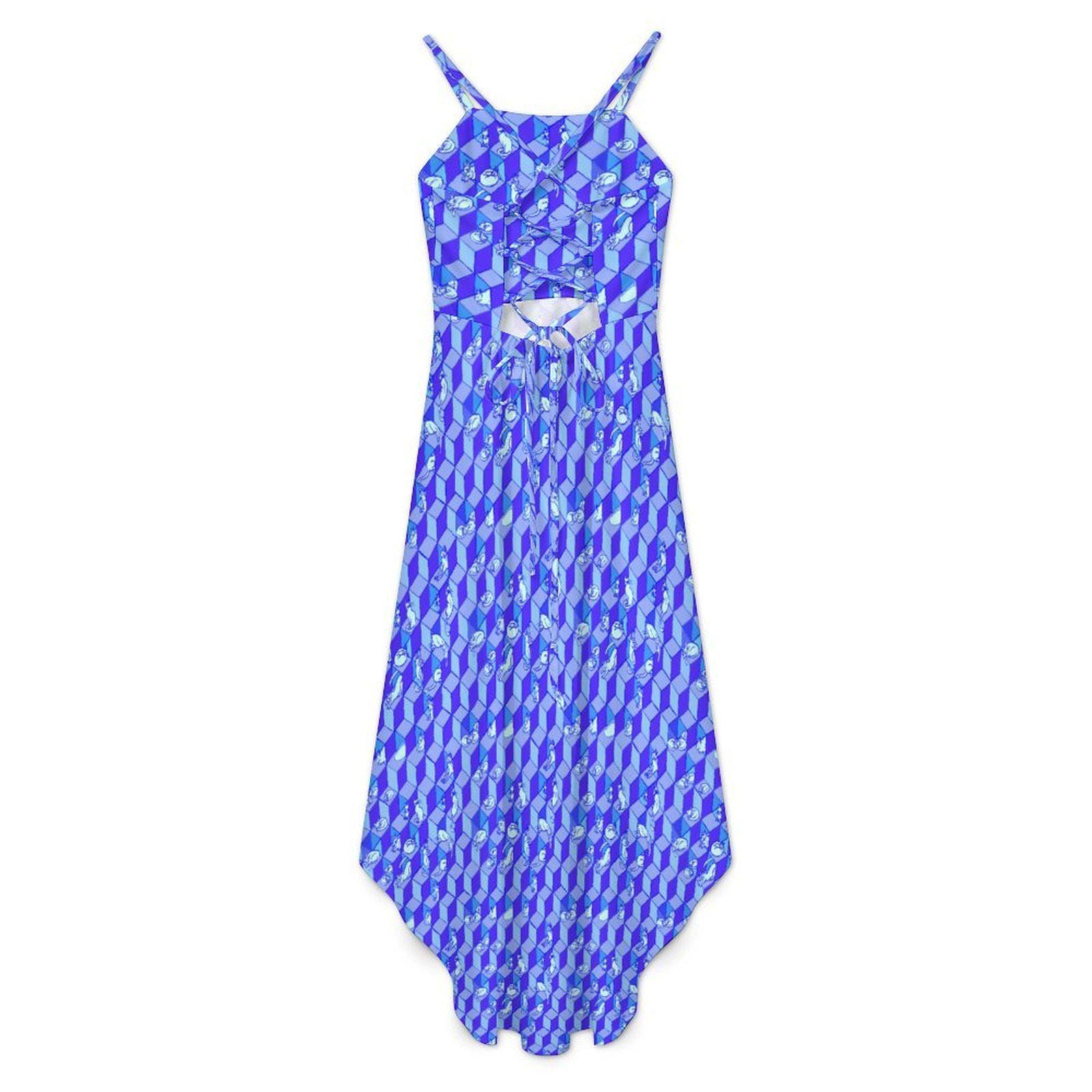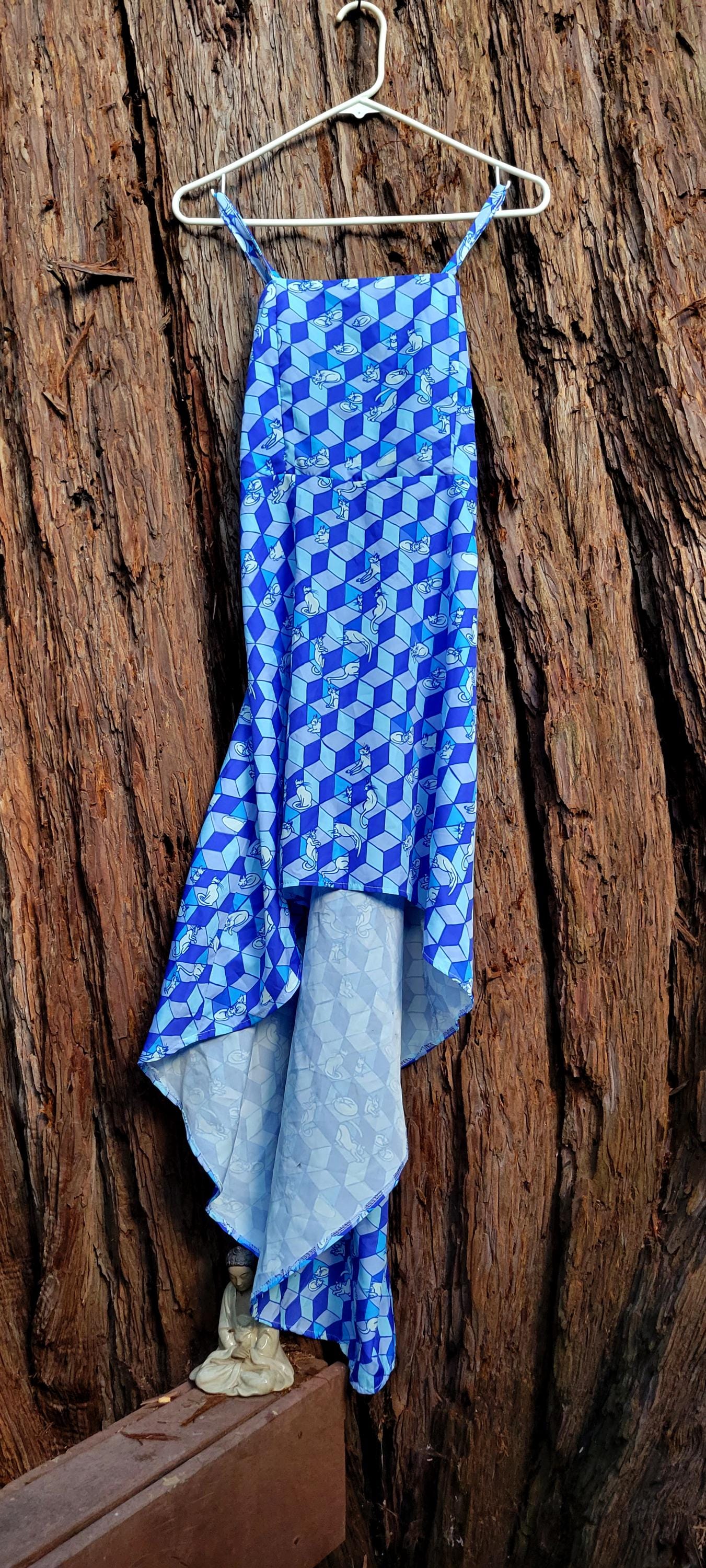 Geometric Optical Illusion Print, Tie-Back High-Low Sundress, in Cobalt Blue.