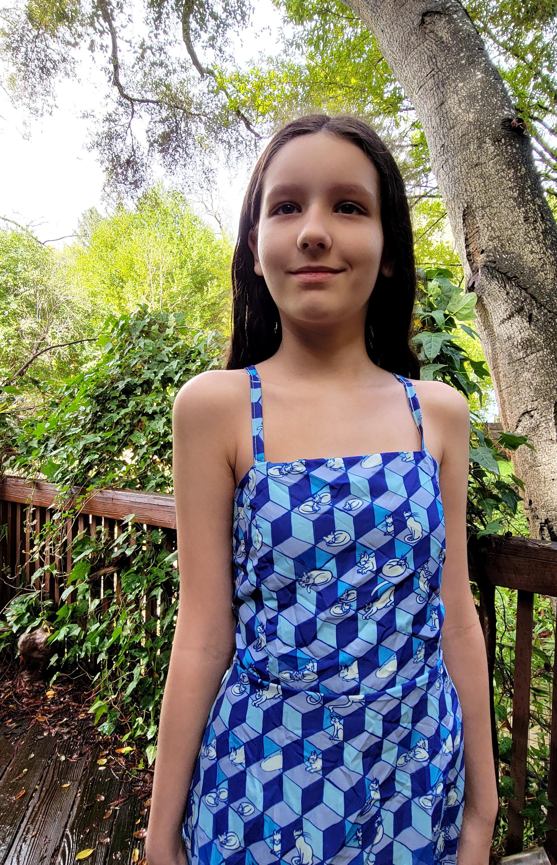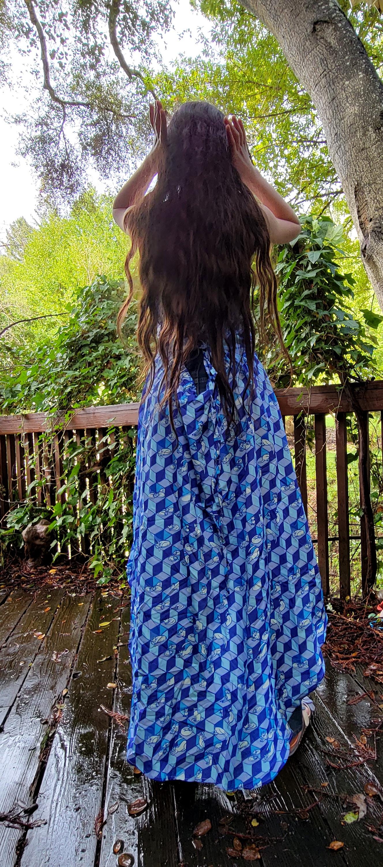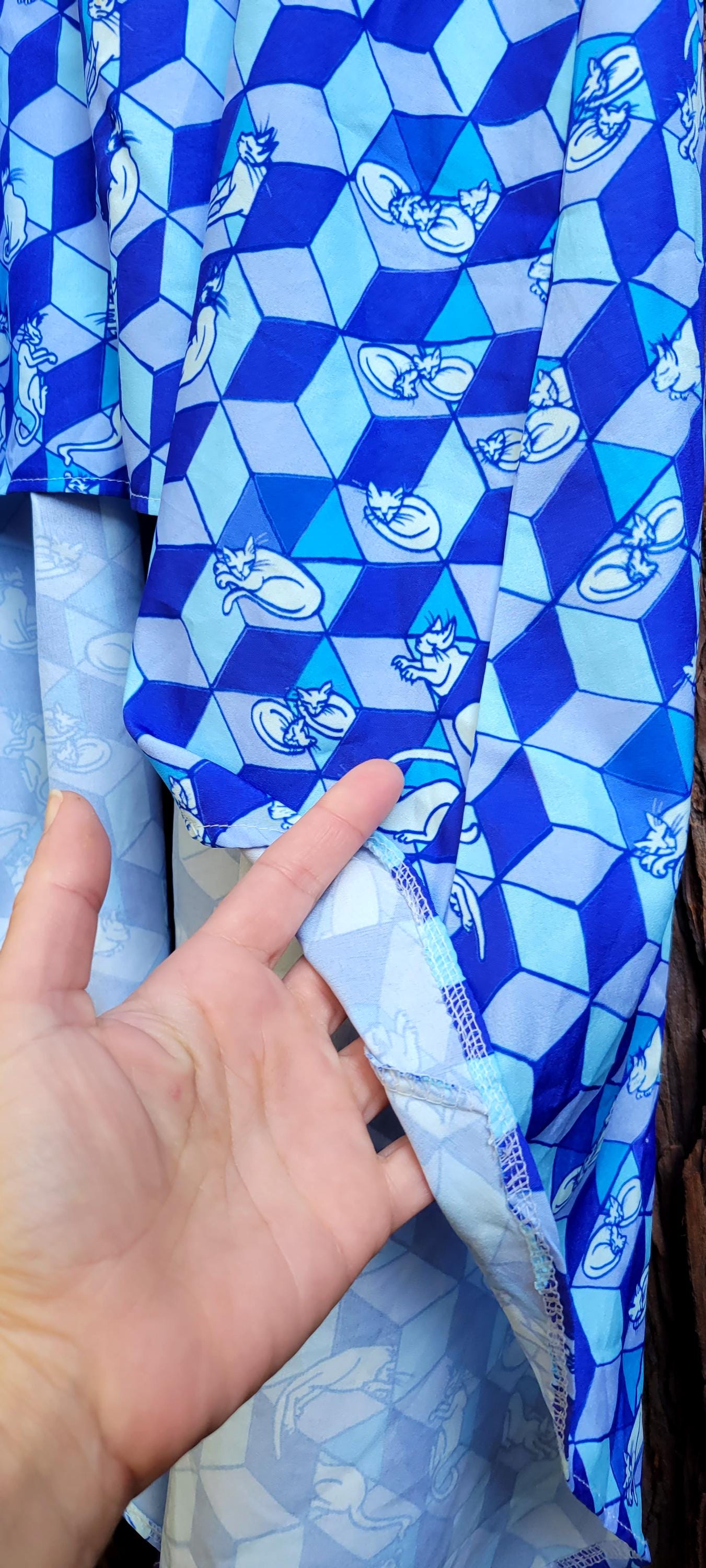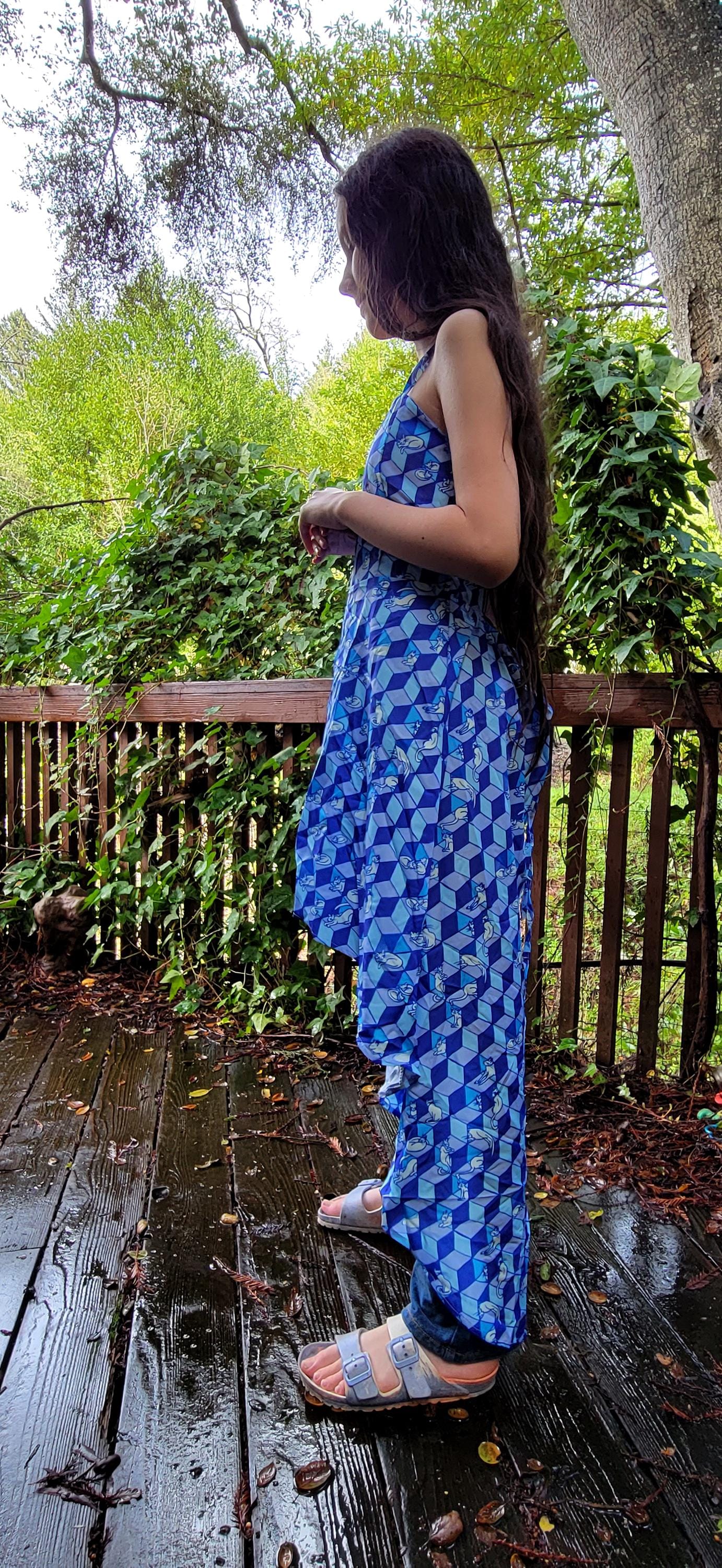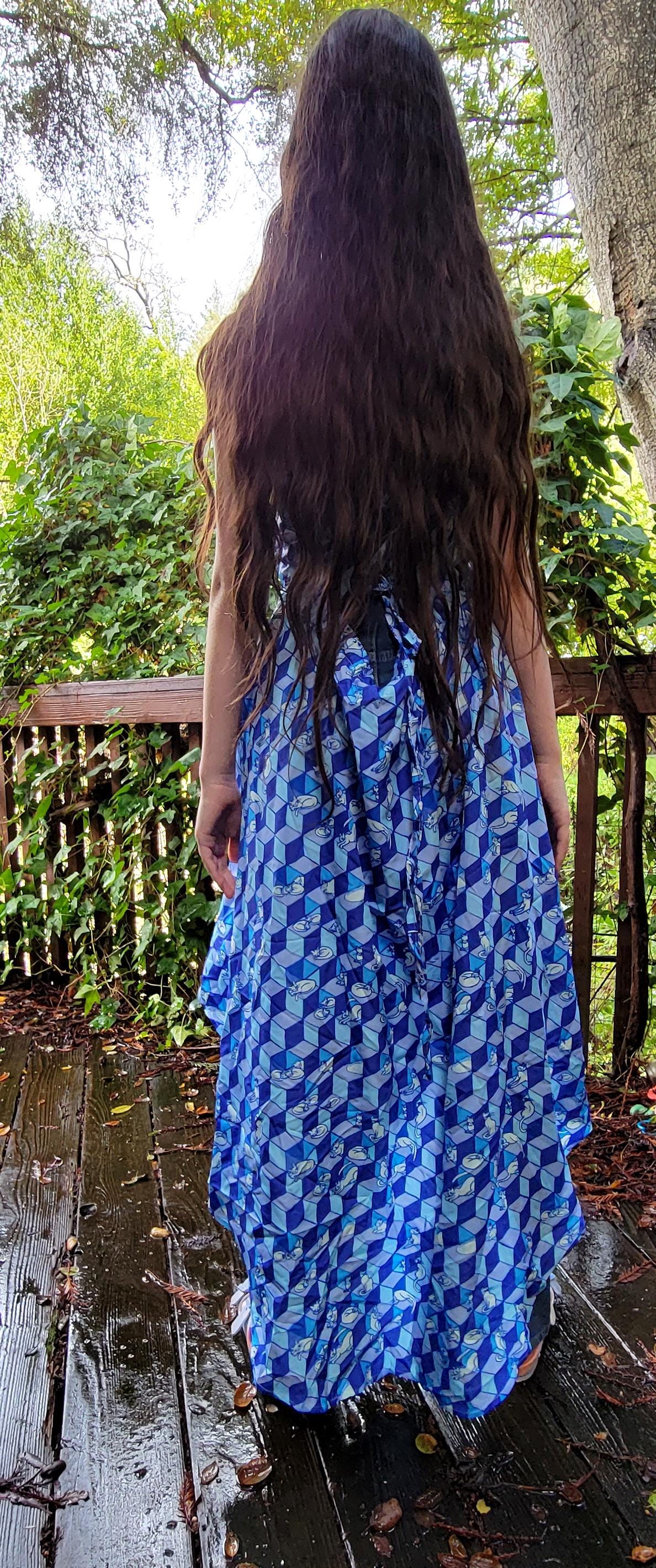 Geometric Optical Illusion Print, Tie-Back High-Low Sundress, in Cobalt Blue.