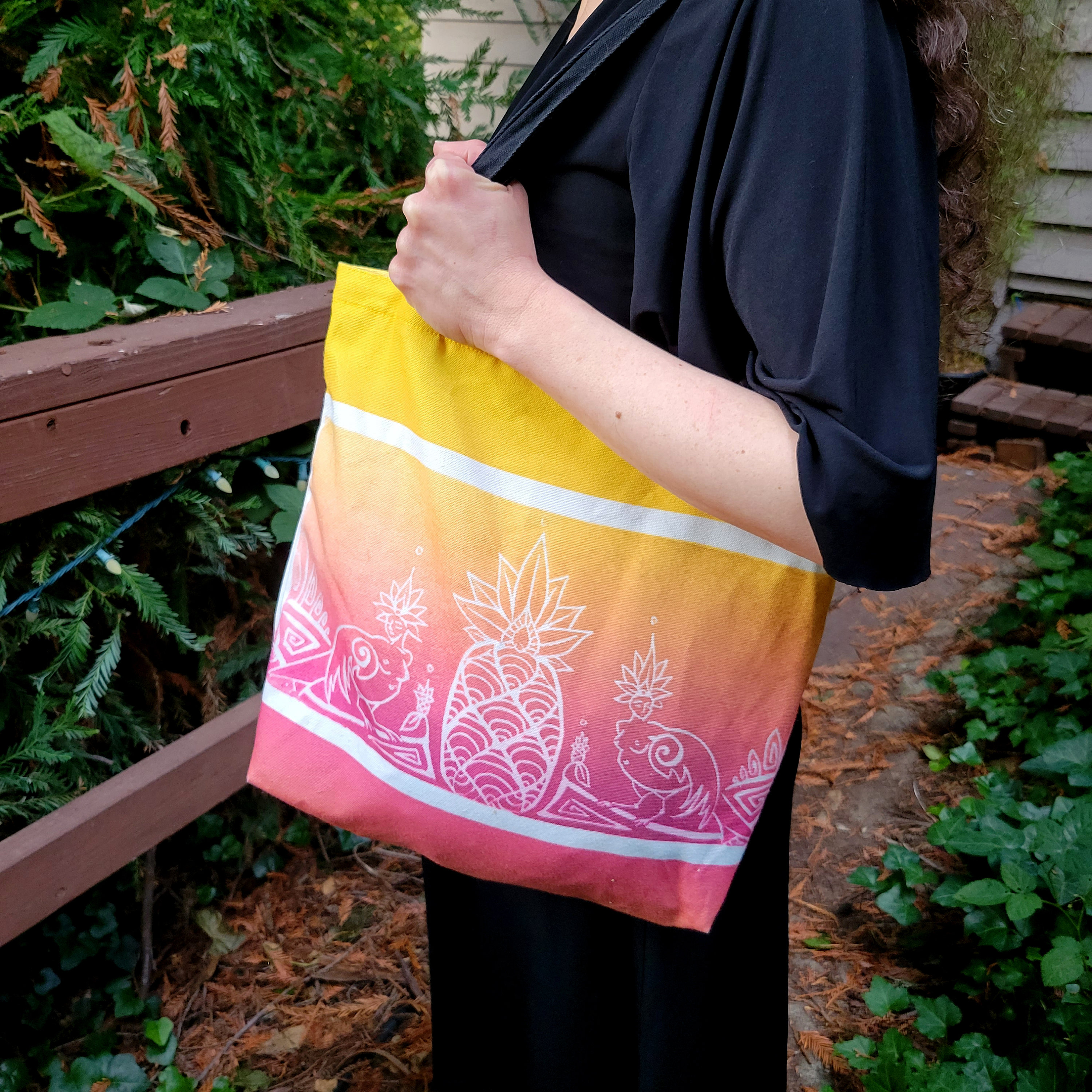 Sirens and Pineapple, Book Bag, Pink & Gold, Tropical Ombre Mythical Character Canvas Tote, with my Original Art from my Block Print.