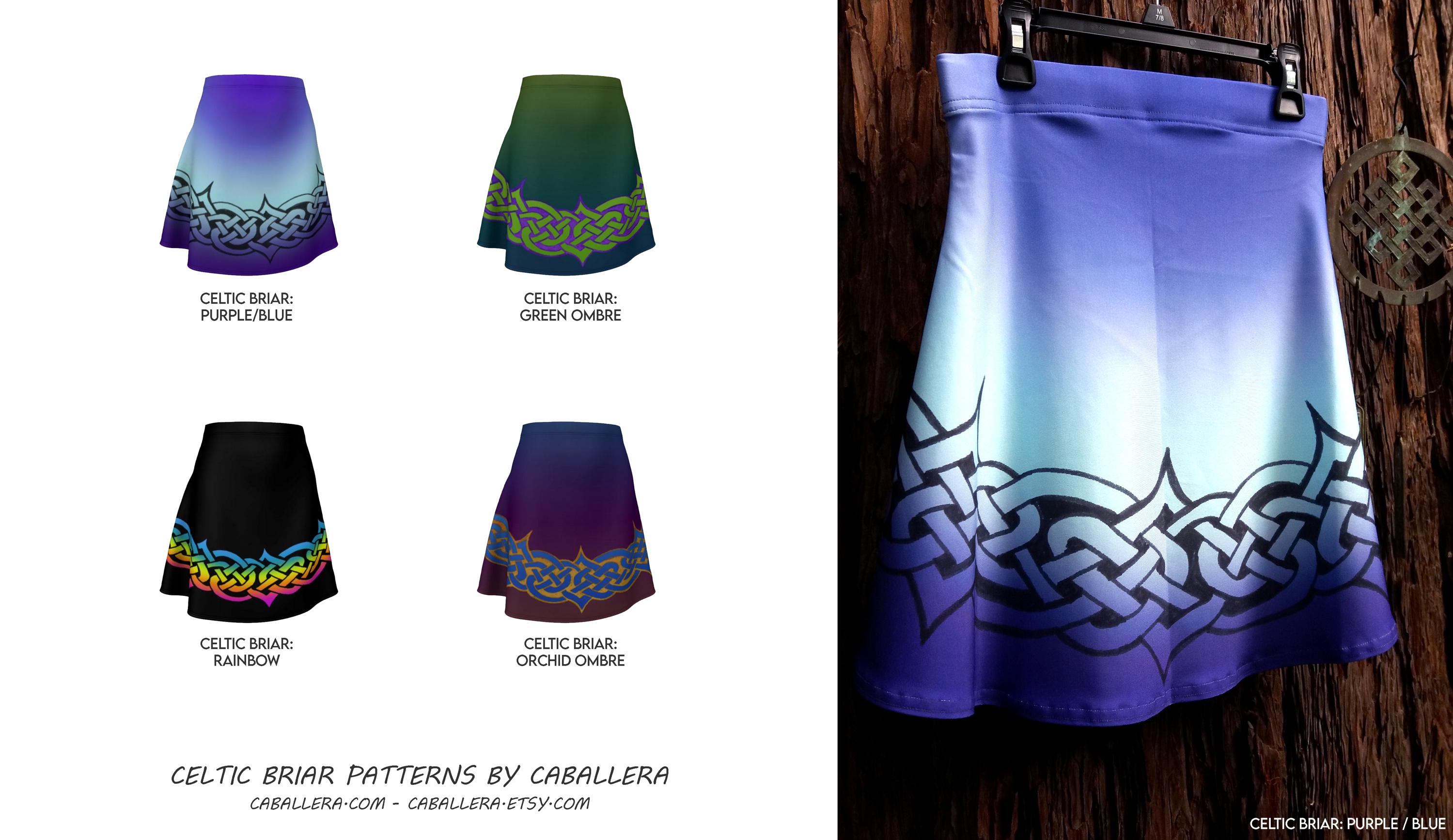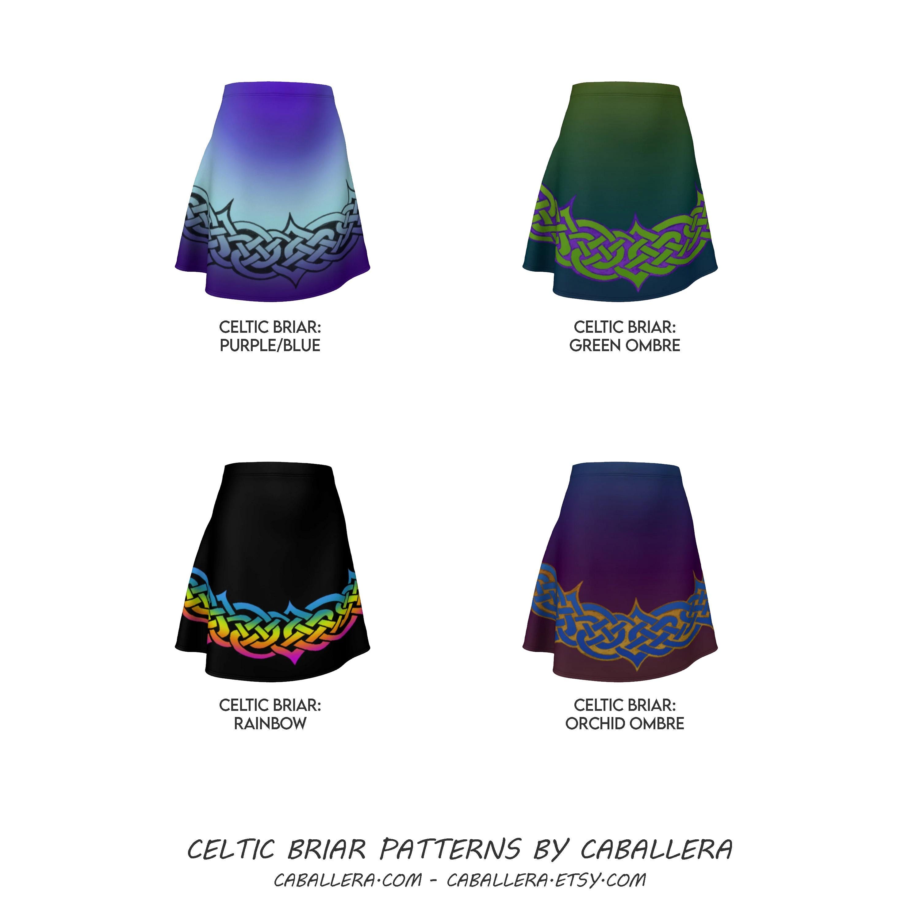 Celtic Briar, Purple & Blue Ombre Flare Skirt, Tangled Celtic Knot Skirt, Above the Knee, Irish Dance Skirt, with Hand Drawn Original Art by Jeremy Richardson for Caballera.